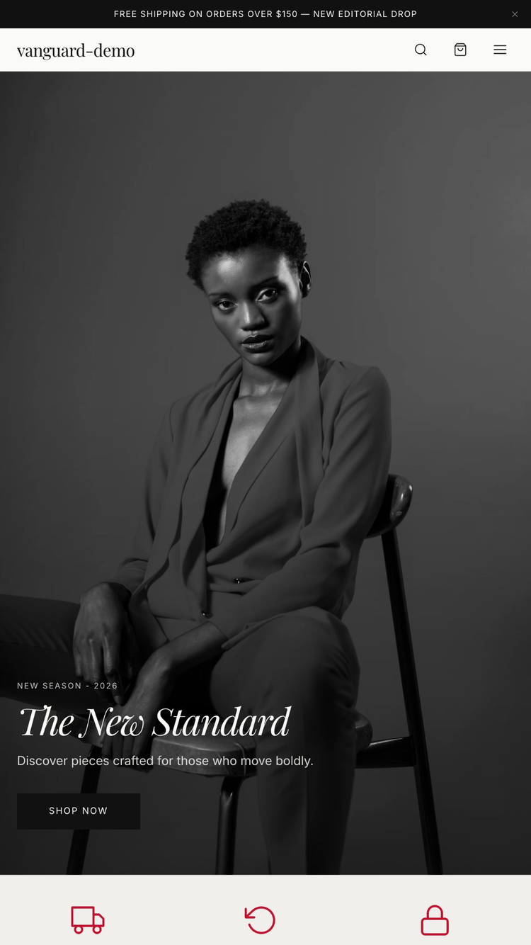 Vanguard is an editorial-inspired Shopify theme designed for fashion and apparel brands that want their storefront to feel like a curated fashion publication. Built on Shopify Skeleton base with 25+ sections, a block-based product page, faceted collection filtering, selling plan support, color swatches, rich media (video + 3D), product recommendations, complementary products, Shop Pay Installments, pickup availability, cart drawer with notes and discount display, country/language selectors, predictive search, scroll animations, and full mobile responsiveness. Typography pairs Playfair Display with Inter. Default color palette uses warm off-white (#FAFAF8) with a bold red accent (#C8102E).
